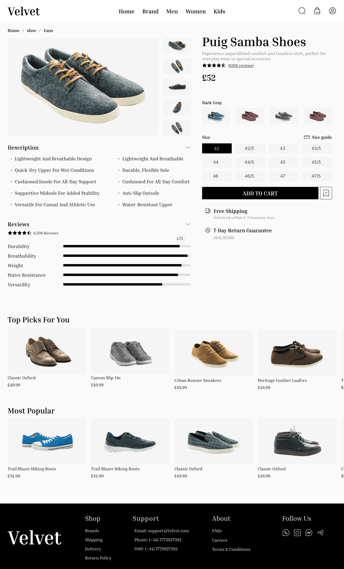 This redesigned Product Detail Page (PDP) focuses on enhancing usability and aesthetics to create a seamless shopping experience. Key features include a clear product presentation with high-quality images, detailed descriptions, pricing, and size options, all strategically placed for easy navigation. Personalized recommendations and a visually balanced layout ensure better user engagement and increased conversion rates.